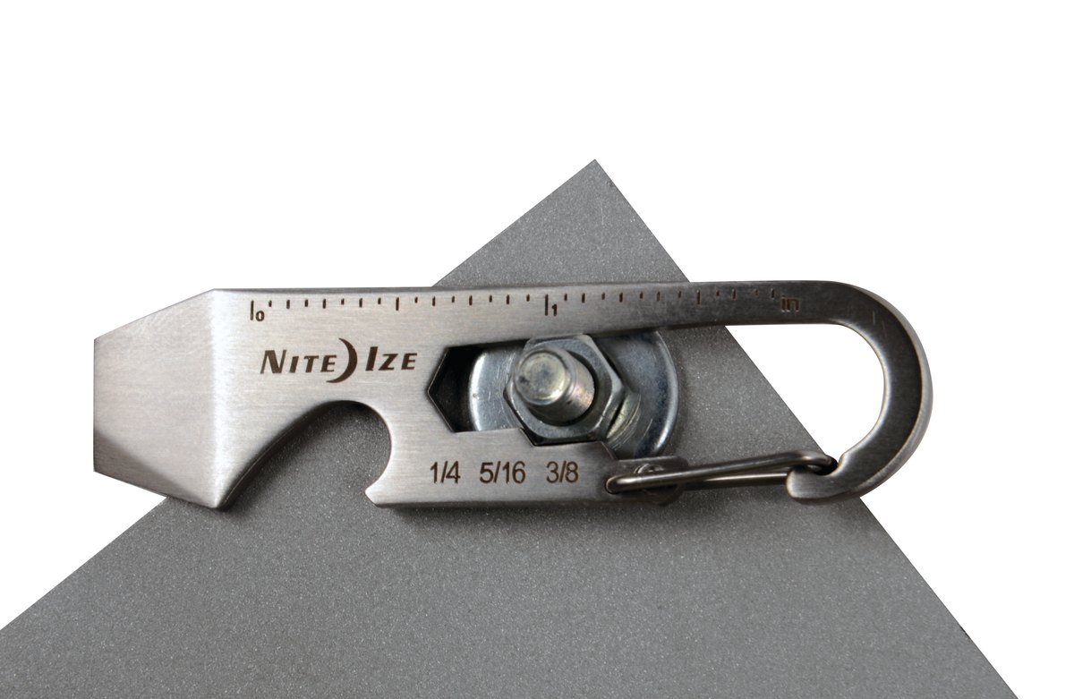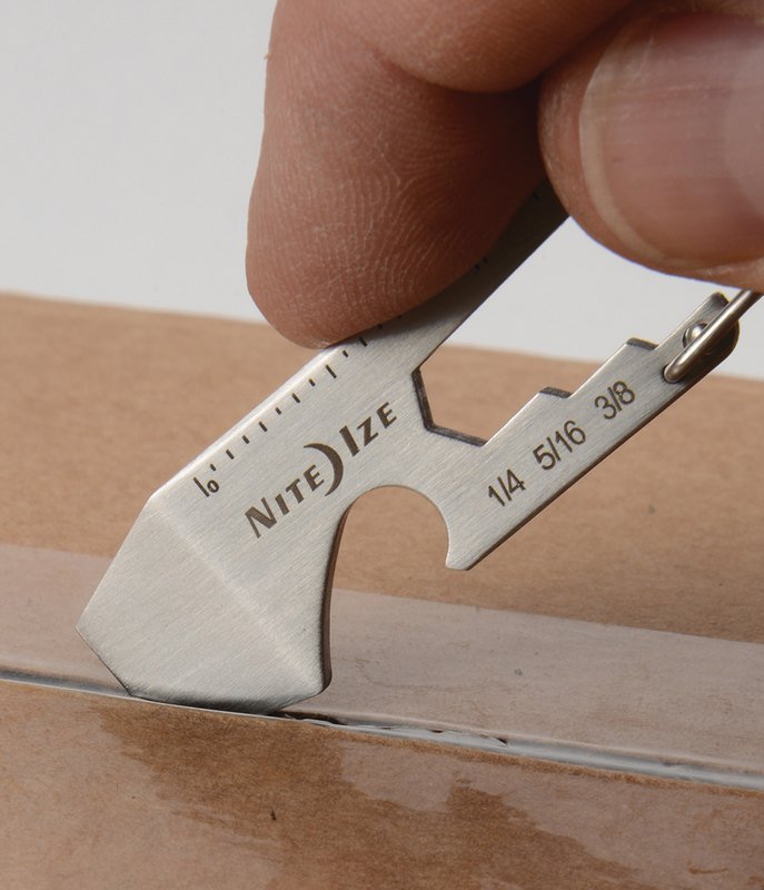 - Features the following tools: Box Cutter, Bottle Opener, Wrench (1/4″, 5/16″, and 3/8″), Ruler (inches and centimeters), and Flat Head Screw Driver